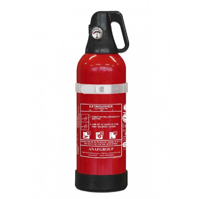 Extincteur à pression permanente à poudre ABC de 2 kg, , certifié EN3 /NF, certifié selon la Directive Equipements sous Pression PED EC/97/23 avec marquage CE et selon la Directive pour la Marine MED 96/98/EC avec marquage CE Réservoir en alliage d’aluminium monobloc, vanne en résine acé-tylique, équipée d’une coiffe et d’une poignée ergonomique qui garantissent sécurité et facilité d’emploi, manomètre de contrôle de la pression en laiton nickelé, support plastique. Tous les extinc-teurs sont protégés par un thermo film transparent